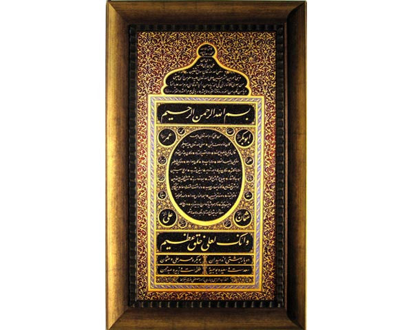Traditionally most Hilya’s follow thestunning graphic format first developed by the great master calligrapher, HafizUsman. The most commonly used Hadith “word portrait” is that by HazratAli, one of the four rightly guided Caliphs and the son in law of the Prophet.Traditionally Quran 21:107 and 68:4 are also commonly used.